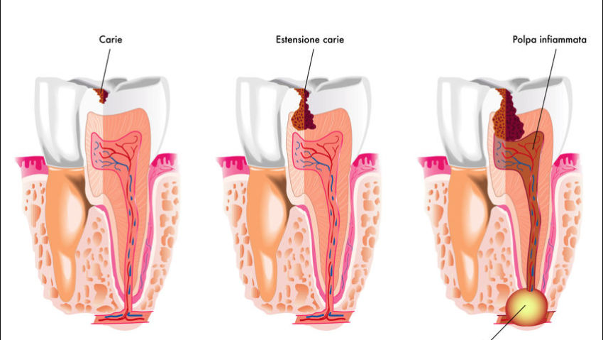 Escluse le situazioni elencate sopra, quando la sintomatologia caldo, freddo, dolce, salato è accompagnata da un dolore più o meno localizzato che perdura per un certo tempo successivamente allo stimolo, questo rappresenta un segno evidente della presenza di una carie già allo stato avanzato. Il danno si estende in rapida progressione e se non intercettato in tempo porta inevitabilmente a fenomeni dolorosi di pulpite (infiammazione acuta) e necrosi (morte cellulare) della polpa del dente stesso. La cura in questa fase tardiva non è più la rimozione della parte cariata e un’otturazione più o meno estesa, ma è necessitano il trattamento endodontico (o cura canalare, detta anche devitalizzazione o canalizzazione).